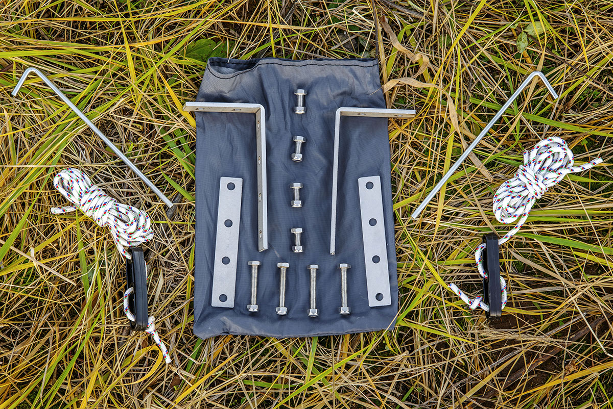 Установка тента под силу даже одному человеку и занимает не более двух-трех минут. В комплект входят веревочные растяжки с возможностью регулировки натяжения и металлические колья для крепления к грунту.